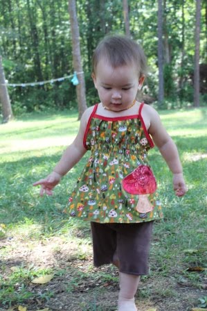If I had intended for this to be a shirred top from the beginning, there are some things I would have definitely done differently, but this worked for my purposes. It was a very quick way (maybe 5-10 minutes from marking the lines to cutting the final threads) to alter this shirt to [mostly] fit my little one! Here are a few action shots: